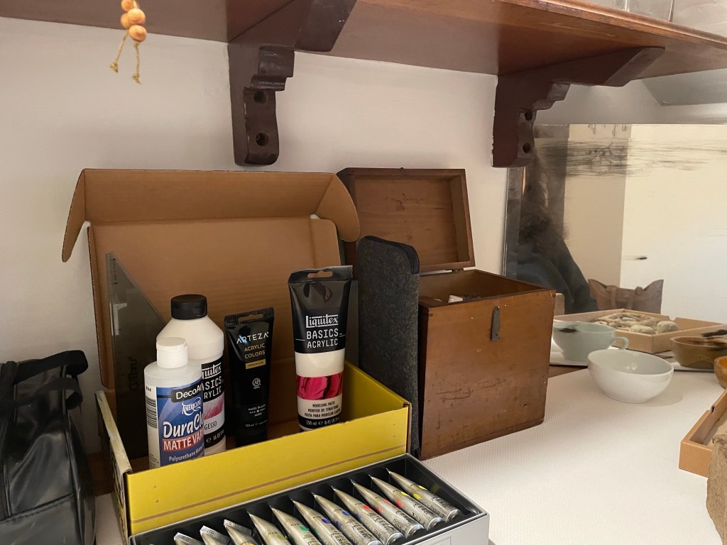 My paints, and fillers arrived. I brought together what I already have and here is my has it all paint 🎨 station 🚉