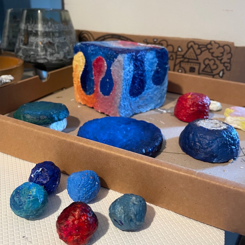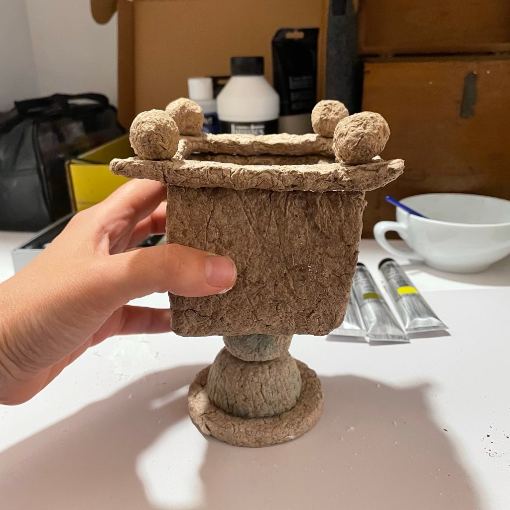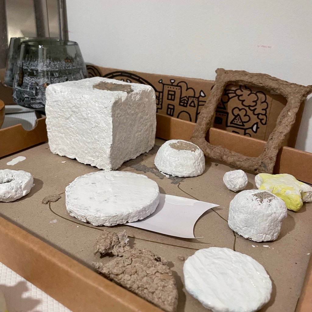 I’m building up my first paper mache piece. These are all test pieces I have tried with paper mashe. Little cups, beads, balls, plates, a frame, and a cube vase. I pressed the mashe in a glass made cube vase. I painted their base. Now I’m waiting for drying.