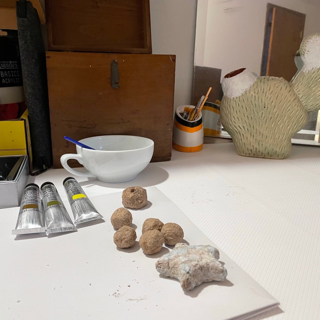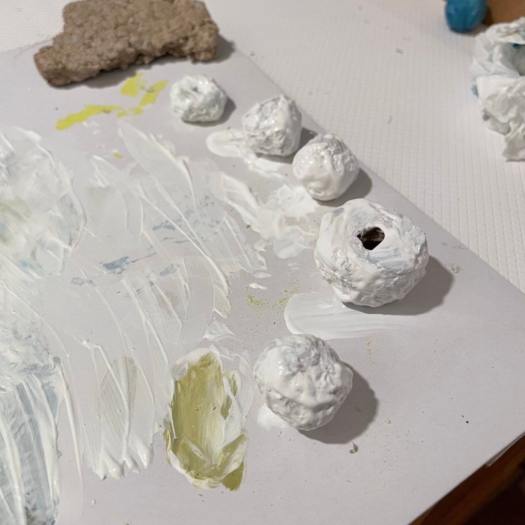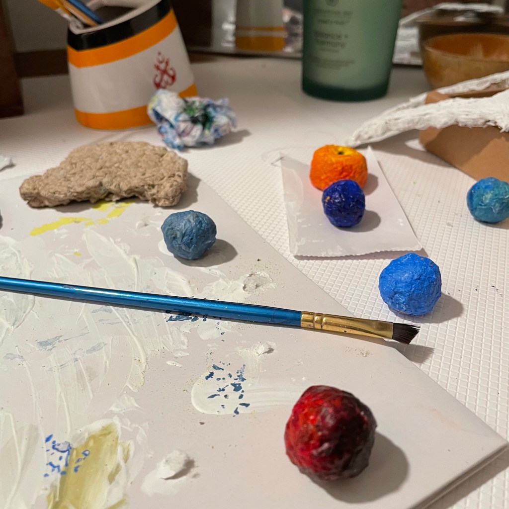 I’m building up my first paper mache piece. These are all test pieces I have tried with paper mashe. Little cups, beads, balls, plates, a frame, and a cube vase. I pressed the mashe in a glass made cube vase. I painted their base. Now I’m waiting for drying.