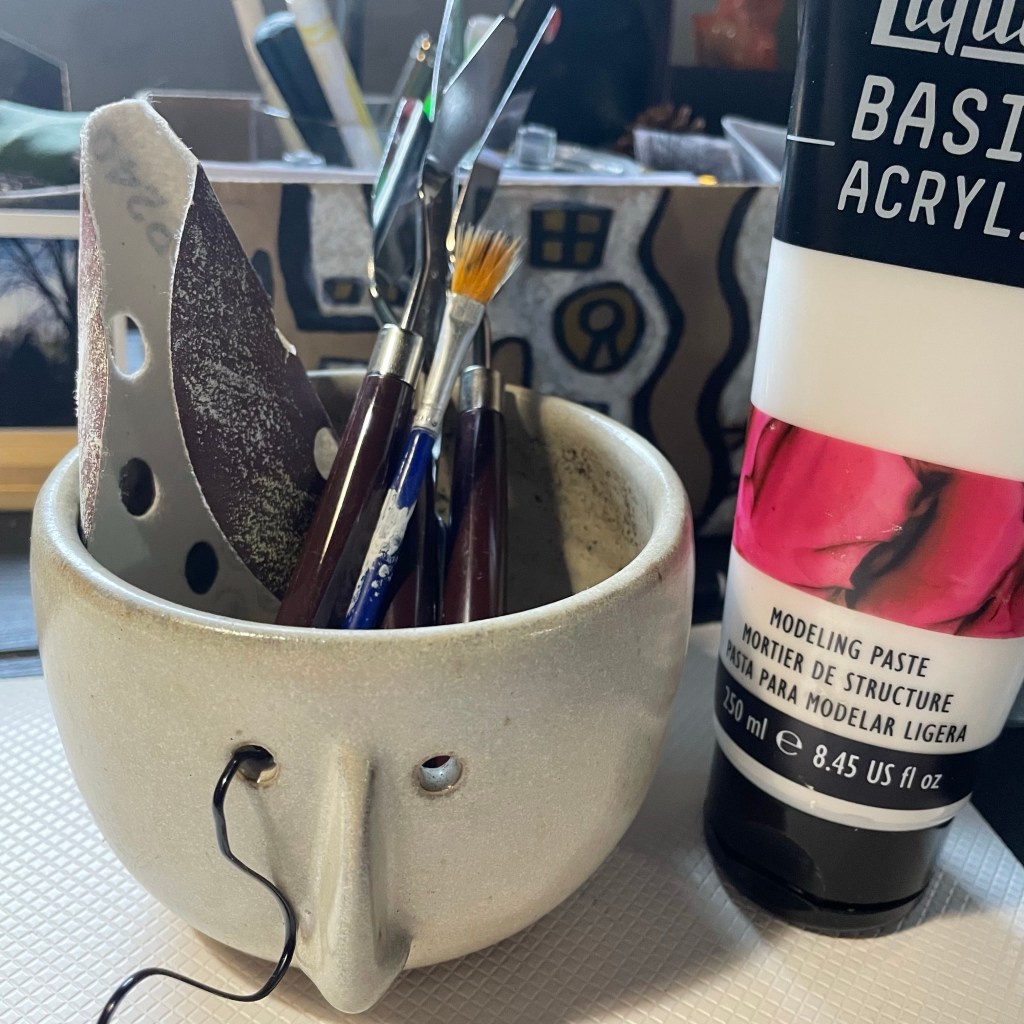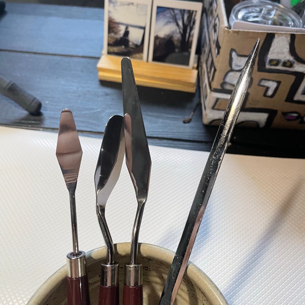 My biggest missing piece was my painting knifes. Now I have a useful set of six. I picked a tool set of 3 knifes, ☝️ brush, fine sand, and my box of acrylic and paste.